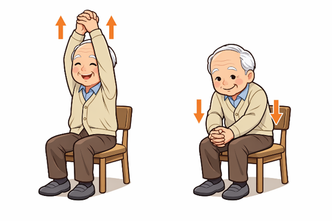 そのまま、組んだ両手をゆっくりと上げたり下げたりしてください。 - ポイント: 動かせる側の手を使って、麻痺がある側の腕を優しくガイドするように動かしましょう。